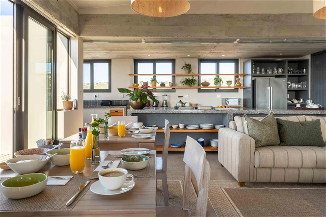 Lounge and dining areas extend to covered outdoor decks, allowing guests to enjoy the gentle sounds of nature. With two pools—an open deck pool and the show-stopping natural pool—Solar House encourages guests to unwind under the Southern Cape sun.