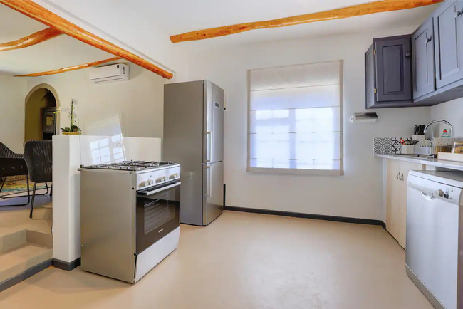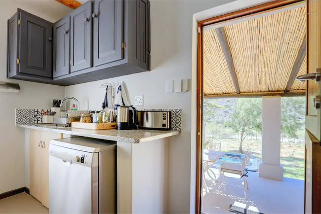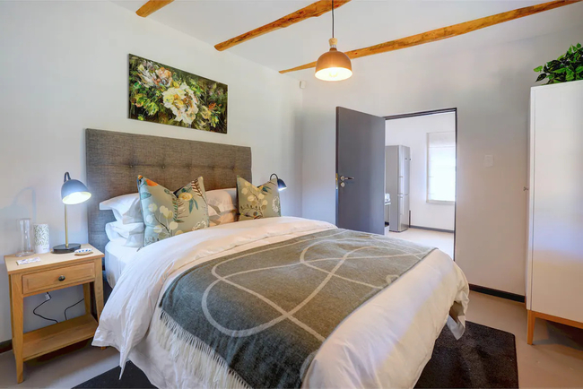 This charming cottage comfortably accommodates up to four guests in two elegantly appointed en-suite bedrooms. The master bedroom features a queen-size bed and an en-suite bathroom equipped with a bathtub, shower, sink, and toilet. The second bedroom also has a queen-size bed and an en-suite bathroom with a shower, sink, and toilet. Fresh linens and towels are provided for your convenience. The well-equipped kitchen includes a fridge-freezer, gas stove, oven, essential cutlery and crockery, and tea and coffee-making facilities. Additionally, a dishwasher is available for your ease. The kitchen seamlessly connects to an air-conditioned lounge, offering plush seating and a welcoming fireplace. A dining area is also provided for enjoying meals. Guests can relax in style on the covered patio, which features a wood-fired hot tub perfect for enjoying starlit nights. The cottage also includes an inviting built-in braai, ideal for memorable dining experiences, all set against the serene backdrop of a lush garden.