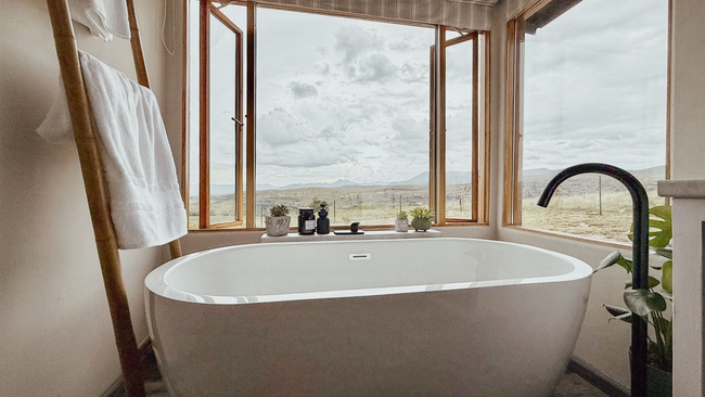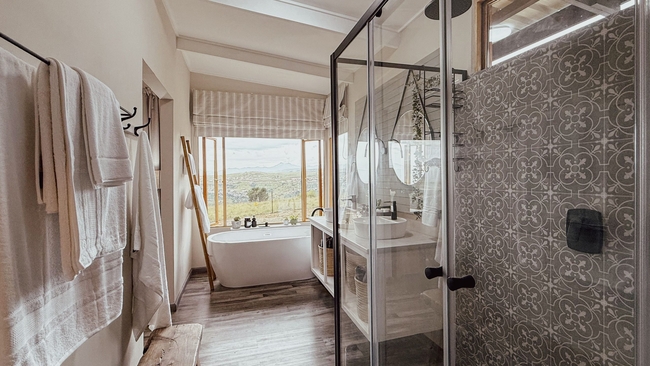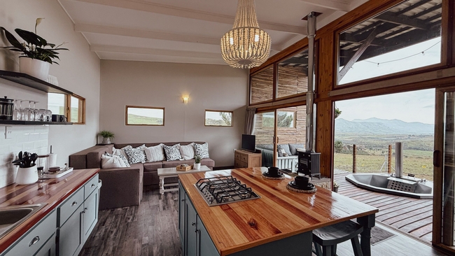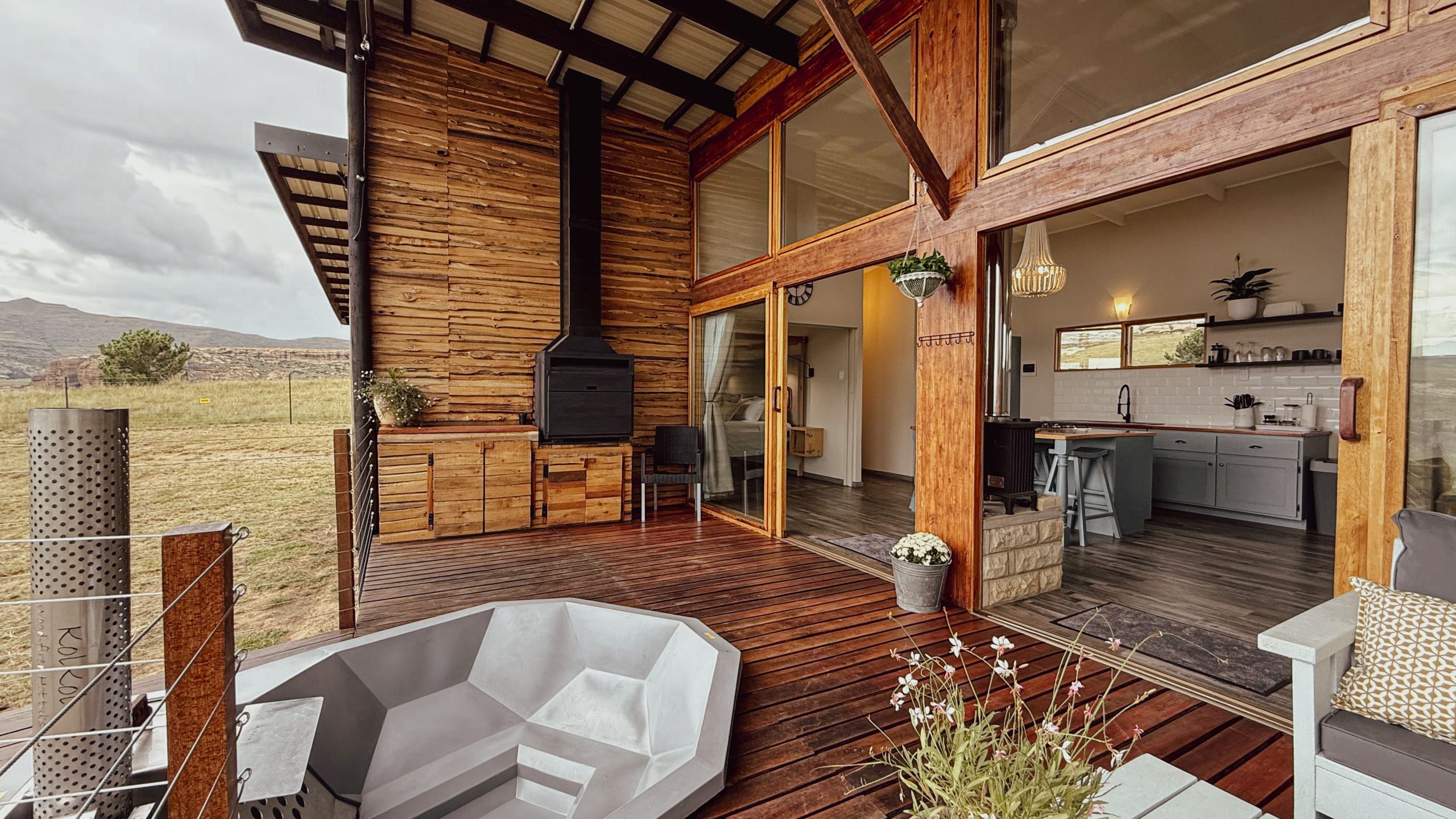 Wood is provided for both the fireplace and the wood-fired hot tub, which offers uninterrupted vistas of the Maluti Mountains and is best appreciated after dark, beneath an expansive Free State sky.