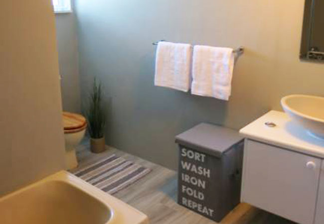 The first floor has two bedrooms; the Main bedroom is furnished with a Queen-size bed and has an en-suite bathroom fitted with a bath, toilet and basin. The second bedroom on this floor is furnished with a double bed and it makes use of a separate bathroom fitted with a bath, shower, toilet and basin.