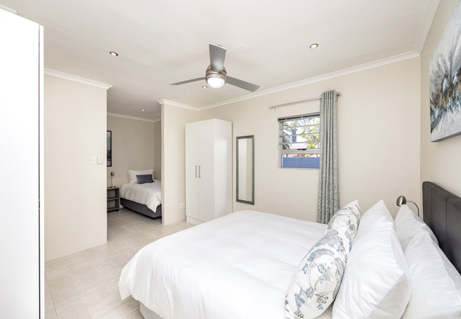The George Apartment is located upstairs and boasts lovely views of Table Mountain. The apartment has two bedrooms and sleeps three guests. The main bedroom is furnished with a Queen-size bed and the second bedroom is furnished with a single bed. The bathroom is fitted with a shower, toilet and basin. The open plan lounge is comfortably furnished and fitted with a Smart UHD TV and keyboard for Netflix and streaming. The kitchenette is equipped for self catering and includes a large fridge, washing machine, microwave, cutlery, crockery and glassware.