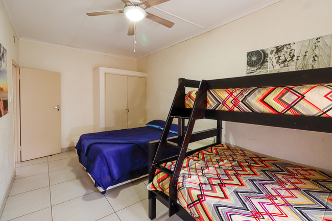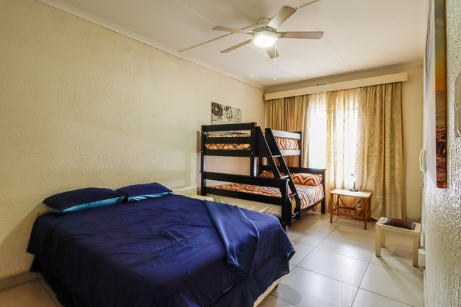 Southgate 3 can accommodate up to six adults and two children. There are three bedrooms on the first floor and two bathrooms. The first and second bedrooms each contain a double bed. The third bedroom has a double bed and a tri-bunk. Guests need to bring their own towels. The kitchen is fully equipped with a stove / oven, fridge / freezer, microwave, kettle and toaster. The dining area has a six seater dining table and chairs. The lounge has flat-screen TV and opens to a balcony with braai facilities. Guests should bring their own standard decoder and card with them or there is no TV available. The Southgate complex offers a communal swimming pool. A lock up garage is available on site.