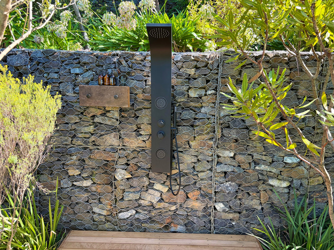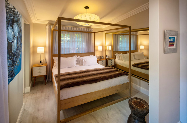 Hotel Room 3 is furnished with a King size, extra length, four poster bed. The room has a full bathroom (equipped with a bath AND shower) with a lovely outside shower. This room also leads onto a small private patio. In winter a comfortable living room allows our guests to relax and read in front of the wood-burning fireplace with a glass of wine and listen to music. Guests have the use of a sparkling rim flow pool in the manicured garden.