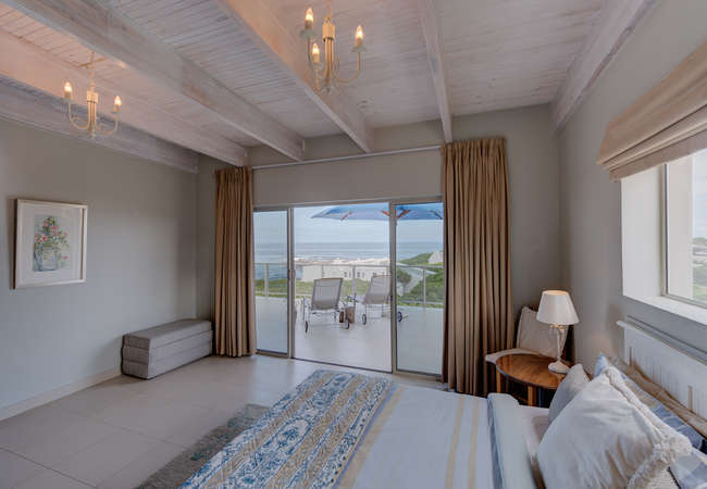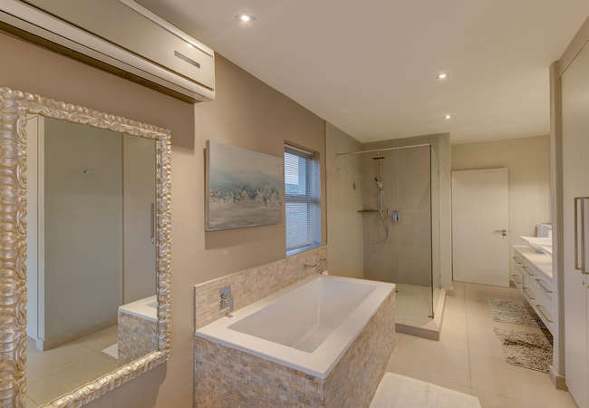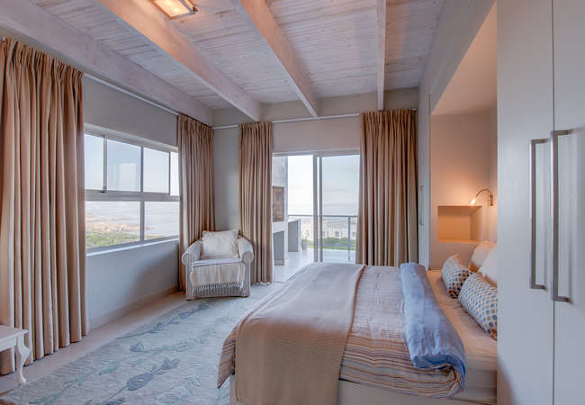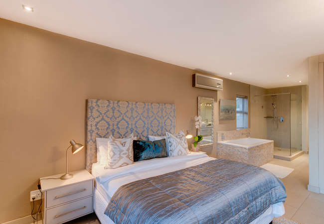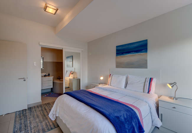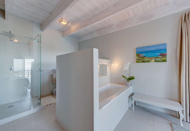 This level of the Villa has three bedrooms. The main room has a King-size bed and a breathtaking view of Walker Bay. There is an open plan bath and a wet-room. The room has its own private toilet. The second and third rooms both have a Queen-size bed and an en-suite bathroom with a shower.
