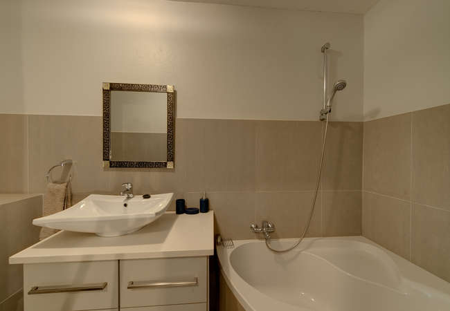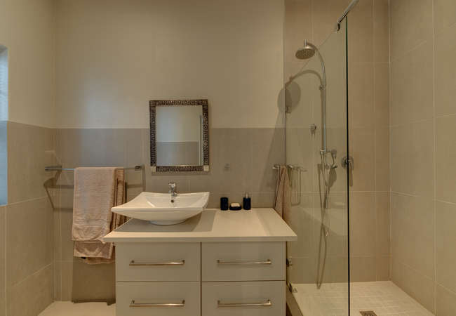Stylishly decorated, this level of the Villa has two bedrooms. The spacious master bedroom is furnished with a King-size bed and an open plan bath and shower. The room leads through sliding doors to a patio. The second room has a Queen-size bed and an en-suite bathroom with a shower. The room also leads onto the patio.