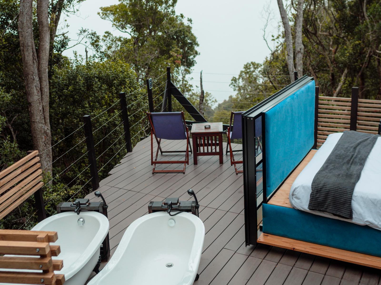 The outdoor - indoor living experience is unique in that you are totally private and feel as if you are the only guests at the reserve. The white canvas triangular shaped dome is cosy and is furnished with a King-size bed. There is a television with Netflix, Wi-Fi and air conditioning. After a fantastic nights sleep, step into the spacious his and hers shower with gorgeous views of the forest. The bathroom also offers heated towel rails. The kitchen and bathroom share a solid roof, wrapped around the side of the Dome. For a bit of home away from home feeling the Forest Dome offers an open air self catering kitchenette with a gas hob, fridge and microwave offering everything you need for your convenience. Laze on the chill net whilst reading a book, listening to the sounds of the forest. Relax in the eco friendly wood fired hot tub while watching the spectacular sunset. Recap on the day while enjoying a braai on the deck using the Gas Braai and chilling at the cocktail bar. We also offer a turn down service.