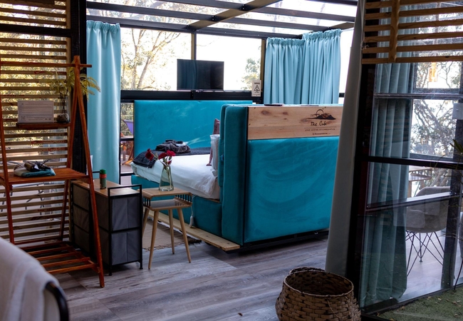 The solid see through cube is furnished with a King-size bed. The best part is that the bed is on a remoted controlled mechanism that allows the bed to be rolled out onto the deck for the ultimate star gazing experience.