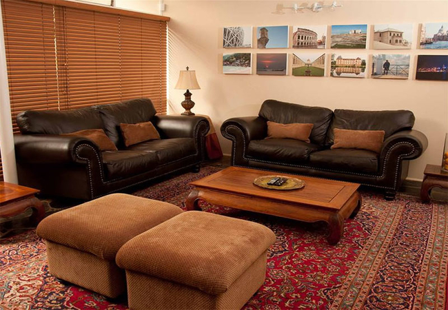 This studio apartment contains two bedrooms, one with a double bed and the other with two single beds. The rooms share a bathroom that has a bath and a shower. The large living area has a comfortable lounge that opens out to the private patio and the garden. The kitchen has four bar stools and is fully equipped. The four lovely apartments all boast DStv, uncapped internet access, electric fencing, 24 hour armed response and undercover parking bays.