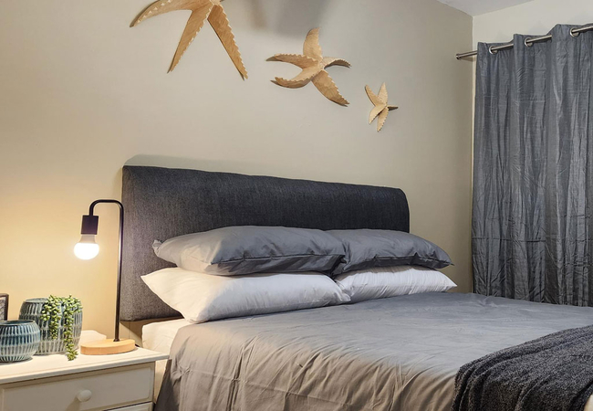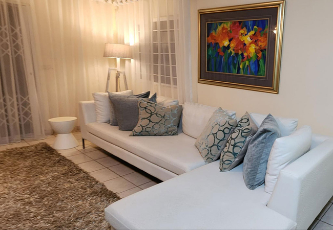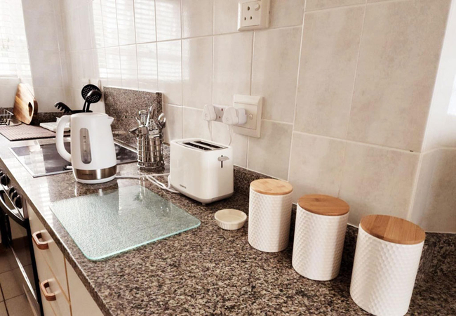 The kitchen is well-equipped for self-catering including a washing machine and ironing facilities. The lounge has a ceiling fan, ample seating and a flat-screen Smart TV with Netflix. Wi-Fi access is provided.