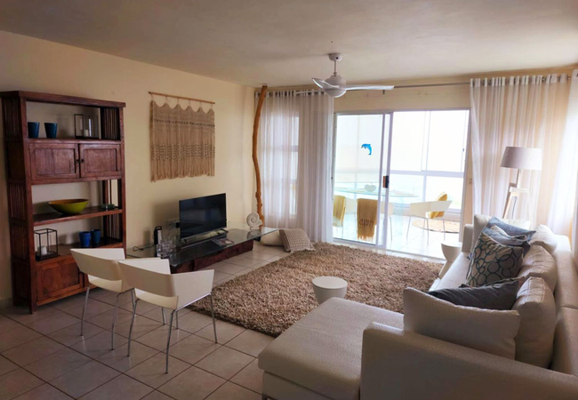The lounge opens to an enclosed balcony with a dining table and chairs and full sea views.