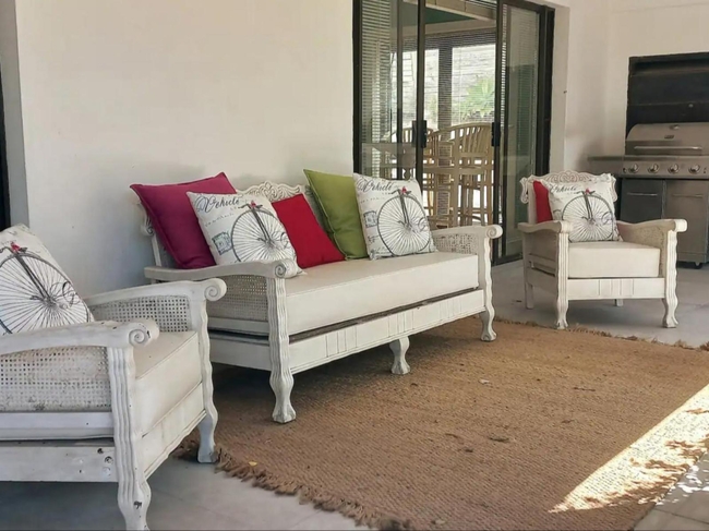 This elegant St Francis Bay home accommodates up to eight guests in four en-suite bedrooms and boasts generous entertainment spaces. The outdoor patio, with its gas braai and pizza oven, overlooks a private pool, offering the perfect setting for alfresco dining. The property is surrounded by beautifully landscaped gardens, adding to the tranquil atmosphere.