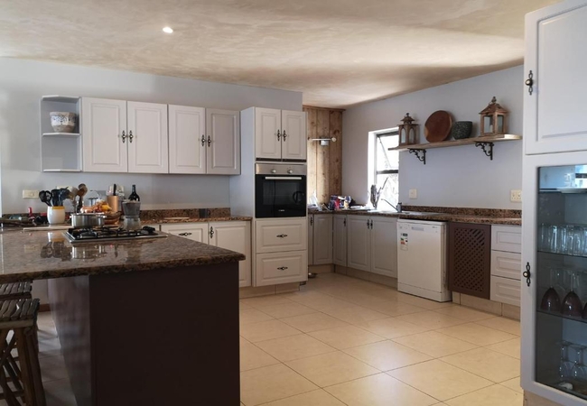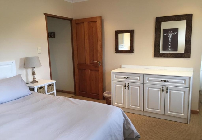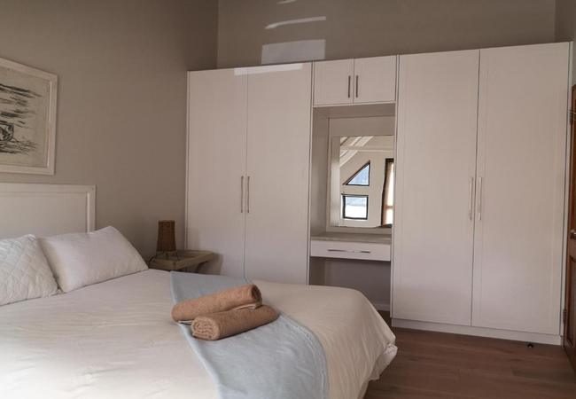 The house is an entertainers dream and consists of two lounges and a fantastic large open plan kitchen and dining room area - the dining room has a magnificent, thick set, dark wooden dining room table. There are two separate braai areas, one covered indoor bar and braai and one braai upstairs on the huge outside patio (this is a great private sun-tanning spot!). There is a bedroom downstairs with an en-suite bathroom, a Queen-size bed and decorated in tranquil linen and white shades. Upstairs has three bedrooms and a TV lounge area: all these bedrooms have ample modern cupboard space with built in dressing tables and mirrors.