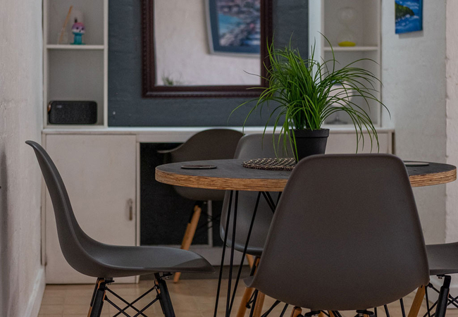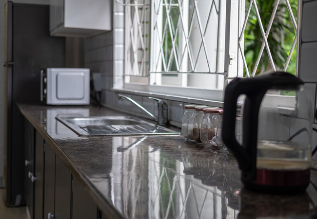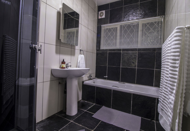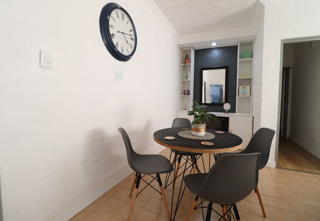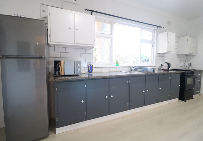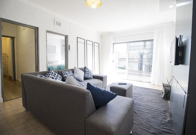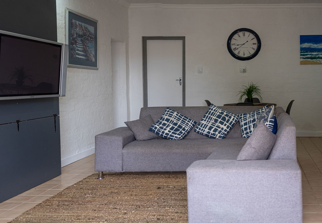 The living area has a comfortable L-shaped couch and a wall-mounted, flat-screen TV with DStv for guests to relax and watch. There is a four seater dining table for guests to enjoy their meals. The fully equipped kitchen includes a fridge / freezer, microwave, tea / coffee making facilities, stove and an oven.