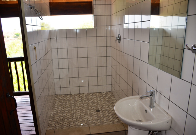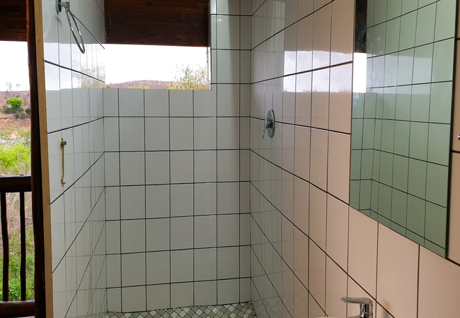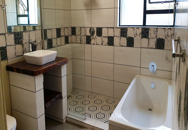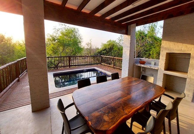 Stoep At Kruger can accommodate a total of 10 guests at a time and comprises 5 bedrooms, 4 bathrooms, and a guest toilet. The main bedroom is furnished with a king-size bed and features an en-suite bathroom fitted with a bath and a shower. The second and third bedrooms have a queen-size bed each, and also include an en-suite bathroom fitted with a shower only. These 3 bedrooms are air-conditioned. Two single beds are available in the fourth and fifth bedrooms, which make use of the fourth bathroom fitted with a shower. All linen and bath towels are provided. The open-plan living area features a kitchen fully equipped with a gas stove, electric oven, microwave, fridge-freezer, and cutlery and crockery. A washing machine and dishwasher are also available in the separate scullery. Leading from the kitchen is an 8-seater dining table and a spacious lounge with comfortable couches. A TV with DStv channels and access to free Wi-Fi is available. A spacious covered patio with outdoor furniture, a dining table, and a built-in braai leads onto a deck with a swimming pool.
