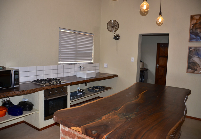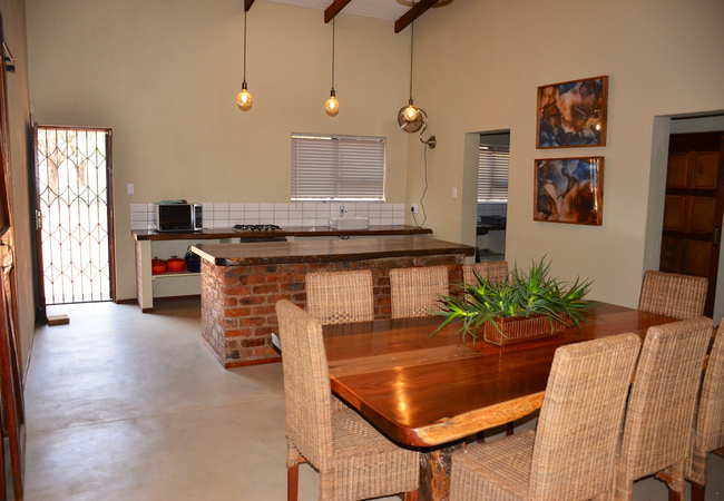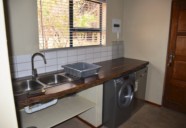 The open-plan living area features a kitchen fully equipped with a gas stove, electric oven, microwave, fridge-freezer, and cutlery and crockery. A washing machine and dishwasher are also available in the separate scullery. Leading from the kitchen is an 8-seater dining table and a spacious lounge with comfortable couches. A TV with DStv channels and access to free Wi-Fi is available.
