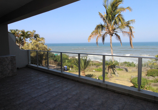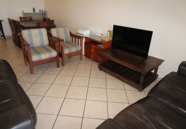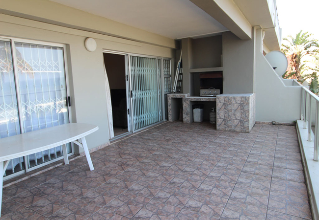 The living area leads out onto a large patio with a lovely sea view. There is also a built-in gas braai on the patio. Guests can access Uvongo's main swimming beach and the Pavilion restaurant through the complex garden.