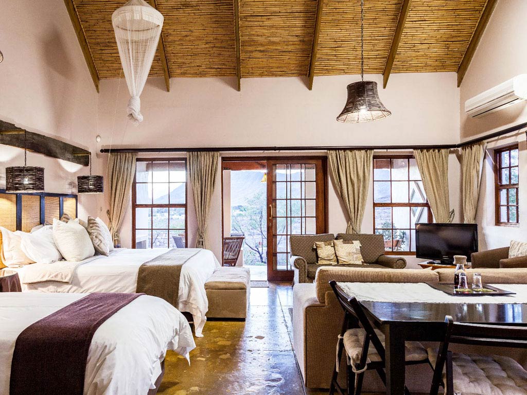 The Karoo holiday cottage is furnished with a King-size bed (or twin beds on request), a single bed and a sleeper couch. The unit is wheelchair friendly and the en-suite bathroom is fitted with a walk in shower with Grab rails with additional hand-held shower, toilet with grab rails and a basin.