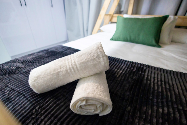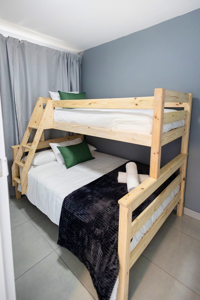 The main bedroom features a queen-size bed, while the second bedroom is equipped with a bunk bed. The bathroom is fitted with a shower-over-bath, washbasin, and toilet. Crisp white linen and bath towels are provided for your convenience, though guests are kindly requested to bring their own beach towels.