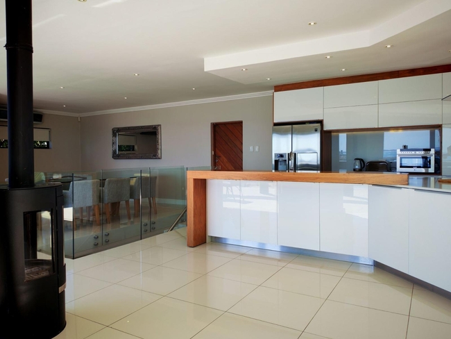 A wood-burning fireplace adds warmth and character during cooler evenings, ensuring the living area remains inviting in every season. From nearly every vantage point, panoramic views stretch across the bay, while at night the Helderberg region comes alive with a striking display of lights.