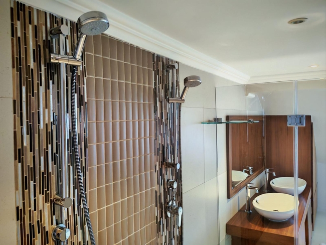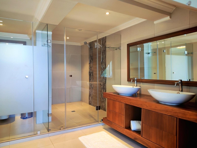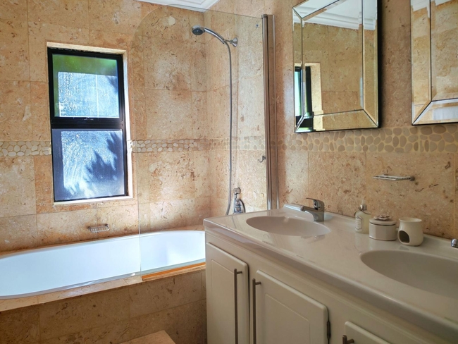 The lower level accommodates three well-appointed bedrooms. The master suite is generously proportioned and features a king-size bed, television, air conditioning, and ample storage space. It includes a private en-suite bathroom fitted with a double shower, dual basins, and a large spa bath positioned to take in expansive views over the swimming pool and surrounding scenery.