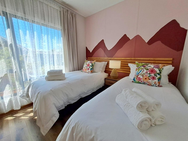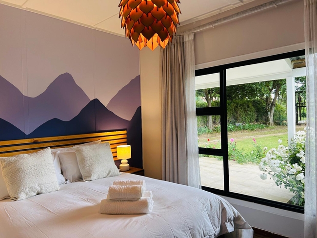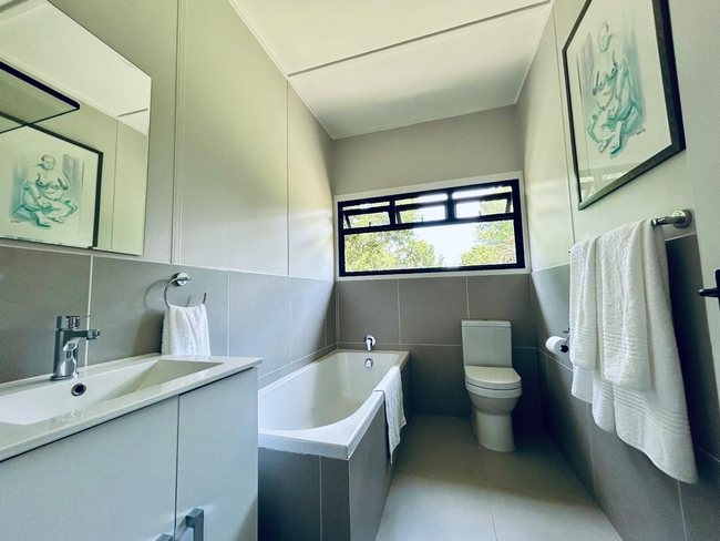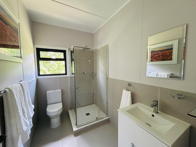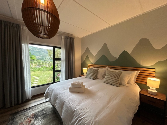 The main bedroom is furnished with a king-size bed and offers views of the garden and conservatory. The second bedroom has a queen-size bed and overlooks the mountains and conservancy, while the third bedroom contains two single beds that can be combined. There are two bathrooms, one featuring a bathtub with garden views and the other fitted with a shower and garden outlook.