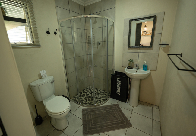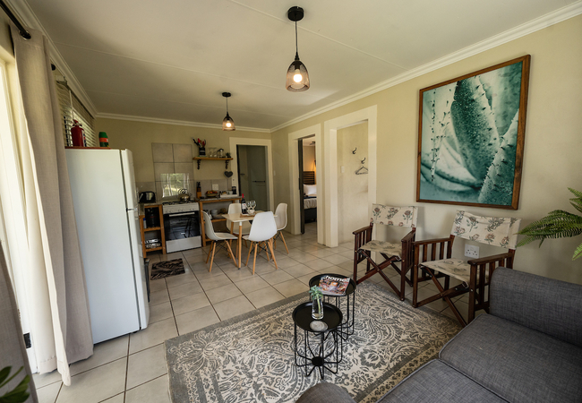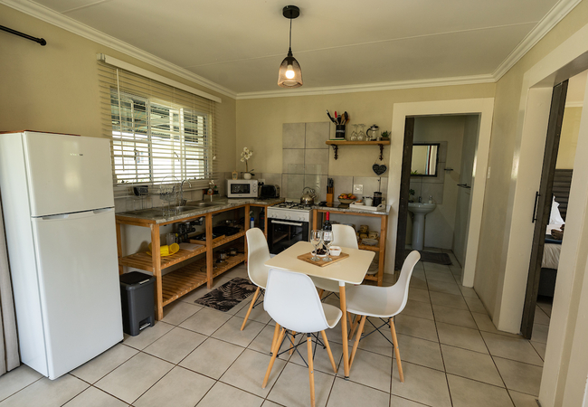 The quaint self-catering apartment shares a large farm stoep with the pother apartments and boasts a beautiful view of the farm. The unit has one bedroom and a bathroom. There is an open plan kitchen / lounge.