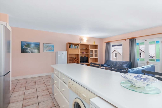 The bright, open-plan living area includes a fully equipped kitchen with a stove, oven, microwave, fridge-freezer, cutlery, crockery, and a breakfast bar with stools. Additionally, a dishwasher and washing machine are provided for guests' convenience.