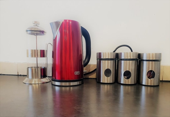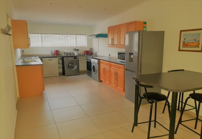 The large open plan modern kitchen is fully fitted and includes a stove with oven, microwave, fridge and all necessary utensils and crockery to self cater. The living area is spacious and has comfortable furniture and a flat screen TV with DStv.