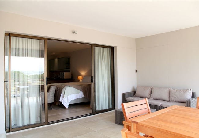 Unit 2 is ideal for families as it is a spacious open plan unit that can accommodate four people with an extra length king size bed and a built-in bunk bed. It opens up onto a private patio with beautiful sea and mountain views.