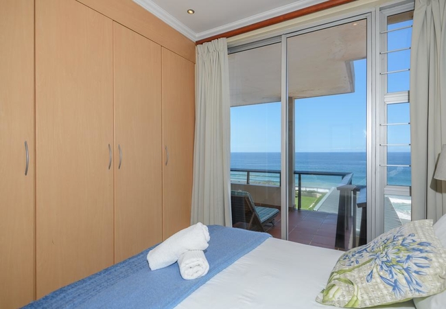 This lovely, spacious apartment has three bedrooms, sleeping maximum six people. There are two bathrooms with bath and shower (main en-suite). Offering spectacular ocean views, it is the perfect holiday spot. The main bedroom has a double bed with air-conditioning, the 2nd bedroom has 2 twin beds and the third bedroom has a double. The 2nd and 3rd bedrooms have stand-up fans and the living areas have ceiling fans. It is a beautifully appointed unit, modern and well equipped for self-catering, including DStv and a large patio with gas braai facilities. Towels are not provided. Please bring your own bath, beach and hand towels. It is serviced three days a week on working week days and has one lock up garage in the perimeters of this small, secure complex. Easy beach access just out the main gate. The complex swimming pool is on the roof, offering further panoramic ocean views and communal braai facilities.