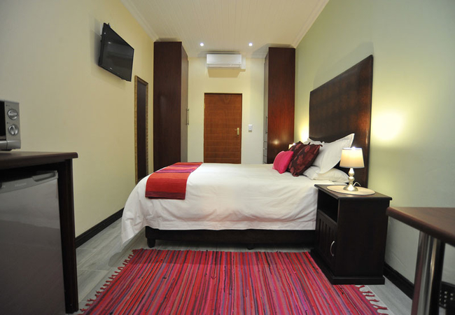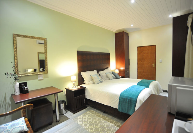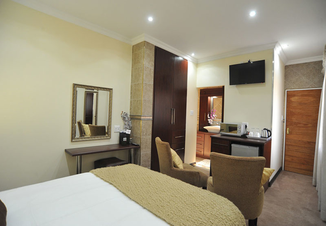 This King Room has a private entrance to unit. Comfortable bedding with extra length King-size bed. En-suite bathrooms. Other facilities include flat screen TV with DSTV bouquet, air-conditioning, kitchenette, work station, Wi-Fi access, mini safe and hairdryers
