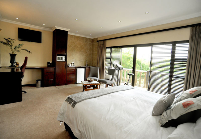The King Room with Balcony has a private entrance to unit. Comfortable bedding with extra length King bed. En-suite bathroom. Flat screen TV with DSTV bouquet. Air-conditioning. Work station. Wi-Fi access. Mini safe. Hairdryers. Private Patio