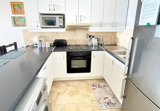 The well equipped apartment consists of three bedrooms and two bathrooms. The main bedroom has a double bed, an en-suite bathroom with a shower and leads out onto the balcony. The second bedroom has a double bed and the third bedroom has two single beds. The bathroom has a bath only.