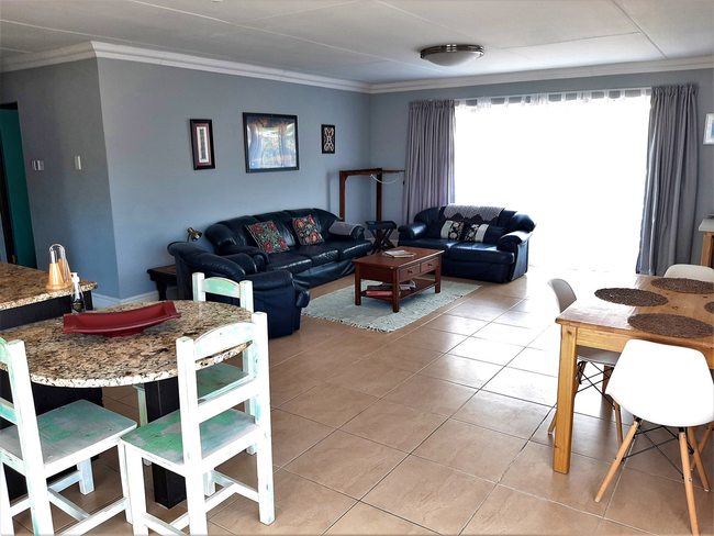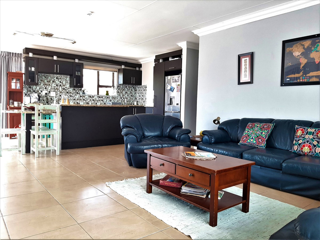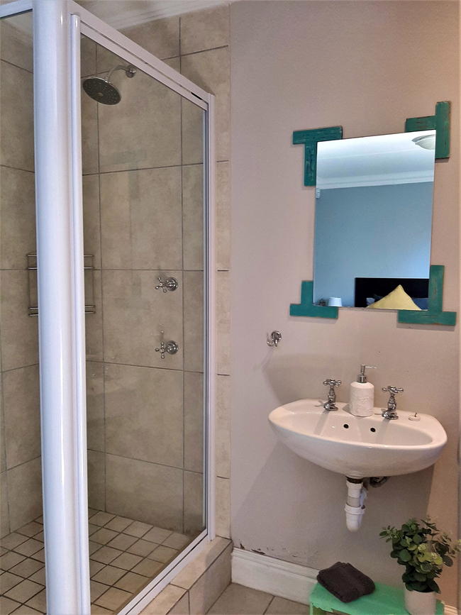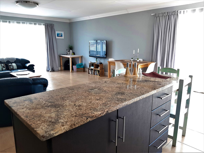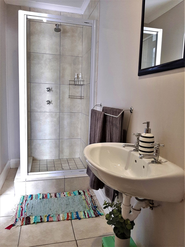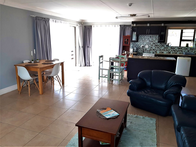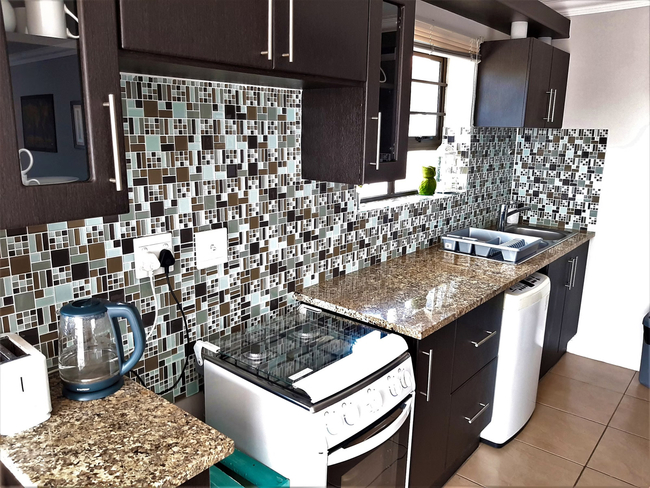 The open-plan kitchen is fully equipped for a comfortable self-catering stay, offering a fridge, oven with stove, and microwave and a washing machine. Guests can enjoy outdoor cooking using the portable braai facilities provided in the shared garden area.