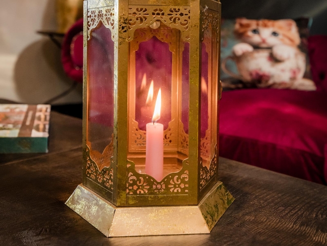 This rose-quartz-inspired room blends warmth and luxury with pink hues, a dark wooden four-poster bed, gold accents and a green velvet sofa. Soft lighting, candlelight and a cosy fireplace create a soothing, romantic atmosphere.