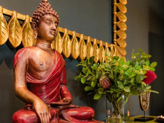This lapis-lazuli inspired room features deep blue walls, golden accents and plush textures. Enjoy a luxurious bathroom with a freestanding bath and walk-in shower, plus a private wooden deck with peaceful garden views.