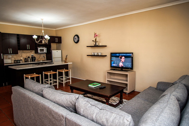 House 22C provides comfortable accommodation for up to 5 guests with three bedrooms and one bathroom. The first two bedrooms are furnished with double beds, while the third features a single bed. The bathroom is equipped with a toilet, bath, and shower. The open-plan kitchen is fully fitted with a stove, oven, fridge-freezer, microwave, toaster, and all essential cutlery and crockery. A breakfast bar with stools offers a convenient dining area. The lounge, located just off the kitchen, includes comfortable seating and a TV with DSTV channels for entertainment. Wi-Fi is available throughout the unit. Outside, guests can enjoy a covered braai area with seating, and there is secure parking for one vehicle behind an automatic security gate.