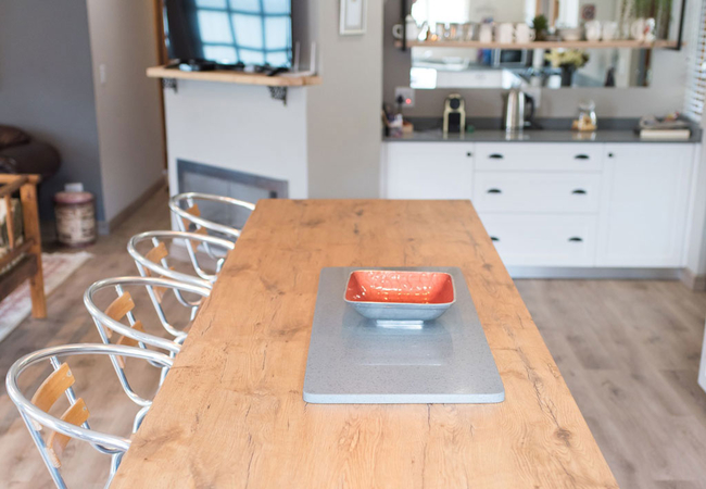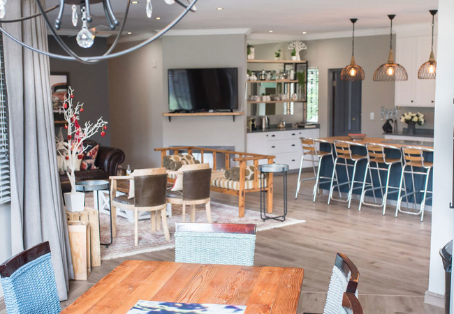 The house offers four bedrooms and can accommodate eight adults comfortably. The main bedroom has a king size extra length bed, built-in cupboard, en-suite bathroom with bath, shower, toilet, bidet and heated towel rail. The second bedroom has a king size bed, built-in cupboard, en-suite toilet only and own entrance door. The third bedroom has twin beds that can be converted to a king size bed on request with a set of cupboards. The fourth bedroom has twin beds and a built-in cupboard. Electric blankets ensure that the bedrooms are warm and cozy. Top quality linen (230 percale), duvets and extra blankets are also supplied. The bedrooms are all supplied with hair dryers. Both bathrooms have both a bath and a shower with heated towel rails and there is a separate 3rd toilet. Additional Facilities: The house has a fully equipped kitchen with a gas / electrical stove, fridge / freezer and a dishwasher for convenience. The open plan living area boasts a fireplace and is equipped with full DStv. Safe parking is available inside a double garage with remote control door.