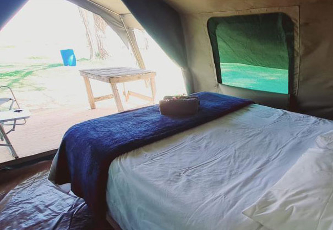 The 4m x 3.5m canvas lodge tent, is furnished with two 3/4 beds with bed linen, 2 stretchers with sleeping bags, towels, camping chairs, 1 rustic table and led lamp. Includes 1 vehicle. Maximum 4 persons. The tent makes use of a shared campsite ablution.