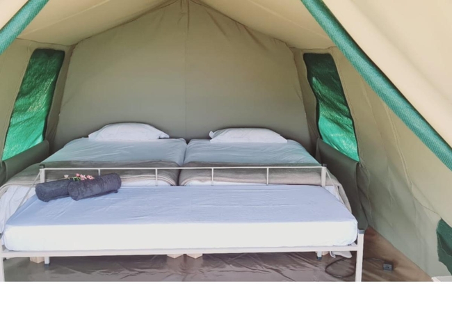 The 4m x 3.5m canvas lodge tent, is furnished with a queen-size bed with bed linen and a bunk bed. The tent is equipped with towels, camping chairs, 1 rustic table and led lamp. Includes 1 vehicle. Maximum two adults and two children. The tent makes use of a shared campsite ablution.