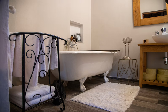 The cottage has one bedroom furnished with a Queen-size bed and a full bathroom. Tarry-Stone Cottages all have fully equipped kitchens with a stove / oven, fridge / freezer, microwave and dishwasher. There is a living area with DStv as well as a cosy terrace or patio. Braai facilities and secure parking is provided.
