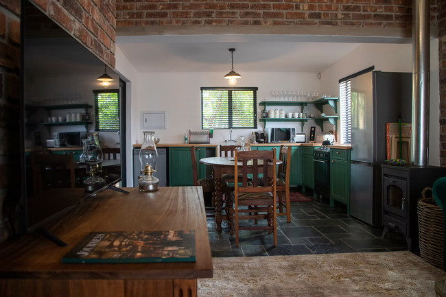 (Old Barn Cottage (Sleeps 2): The cottage has one bedroom furnished with a Queen-size bed and a full bathroom. Tarry-Stone Cottages all have fully equipped kitchens with a stove / oven, fridge / freezer, microwave and dishwasher. There is a living area with DStv as well as a cosy terrace or patio. Braai facilities and secure parking is provided.
