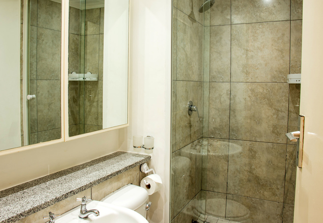Off the main bedroom and lounge are sliding doors that lead onto a patio. The other two bedrooms are each furnished with two single beds (which can be converted into King-size beds on request). These two bedrooms share a bathroom with a shower and toilet.