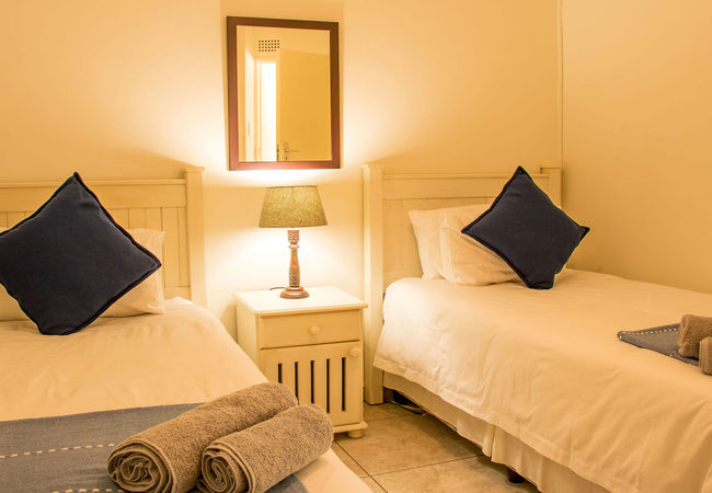 The apartment consists of a lounge, dining room, fitted kitchen and three double bedrooms. The main bedroom is furnished with a Queen-size bed and has an en-suite bathroom with a bath only. Off the main bedroom and lounge are sliding doors that lead onto a patio. The other two bedrooms are each furnished with two single beds (which can be converted into King-size beds on request). These two bedrooms share a bathroom with a shower and toilet. The holiday apartment is air-conditioned and there are ceiling fans in the lounge and bedrooms. The kitchen is modern and well equipped with a fridge, under counter oven, hob, microwave, washing machine and tumble dryer. The apartment has DStv on a large flat screen TV in the lounge. There is also a DVD player in the apartment.