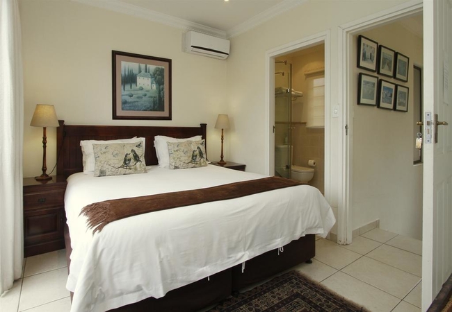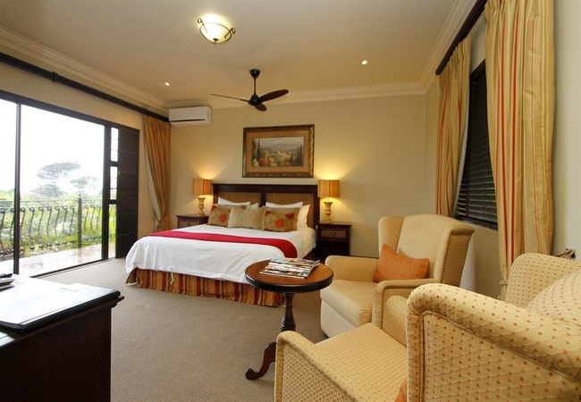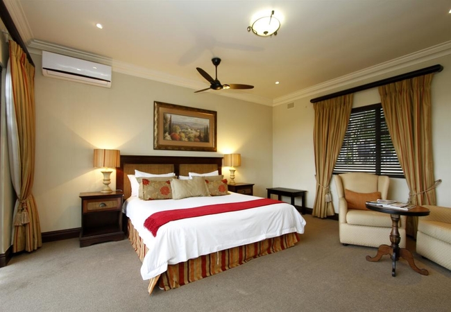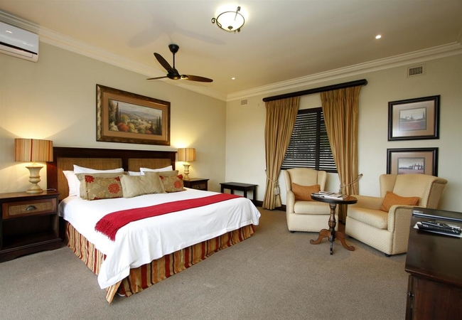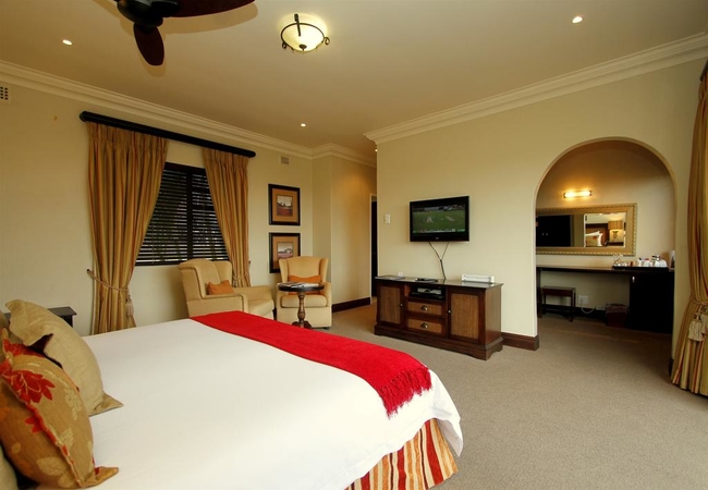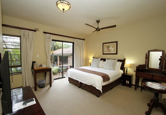 This is a Ground floor room with full bathroom en-suite opening onto garden and pool area. King size bed or twin beds. Each room has DSTV (hospitality bouquet), DVD player, hairdryer, safe and tea tray. Mini bar fridges either in bedroom or access to mini bar fridges.