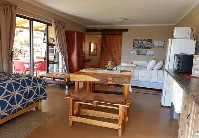 This room is furnished with a Queen-size bed as well as a coffee station consisting of a kettle, coffee, tea, milk, sugar, and rusks. No braai facilities.