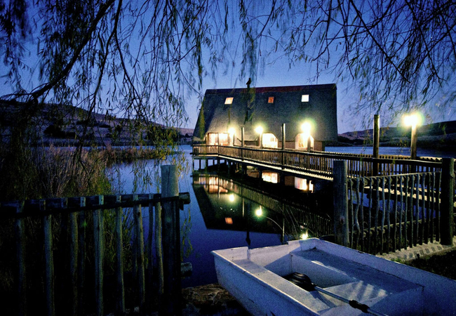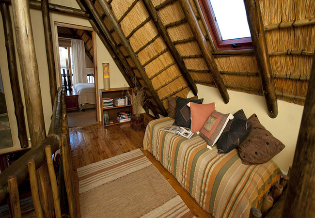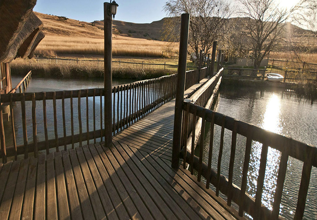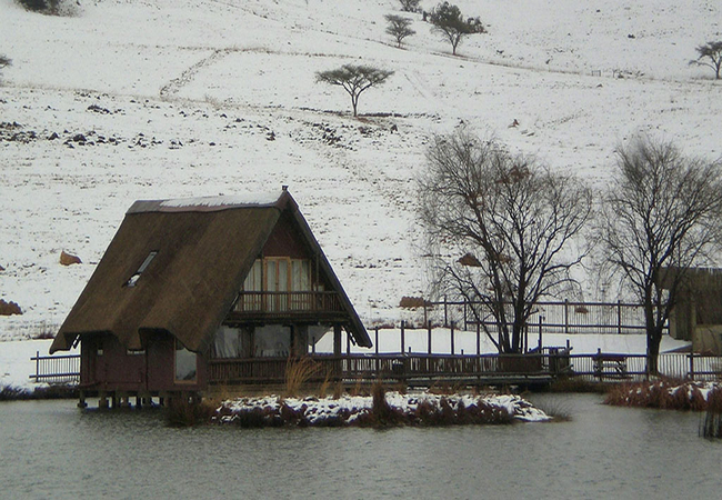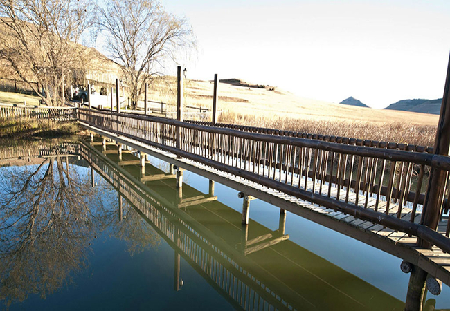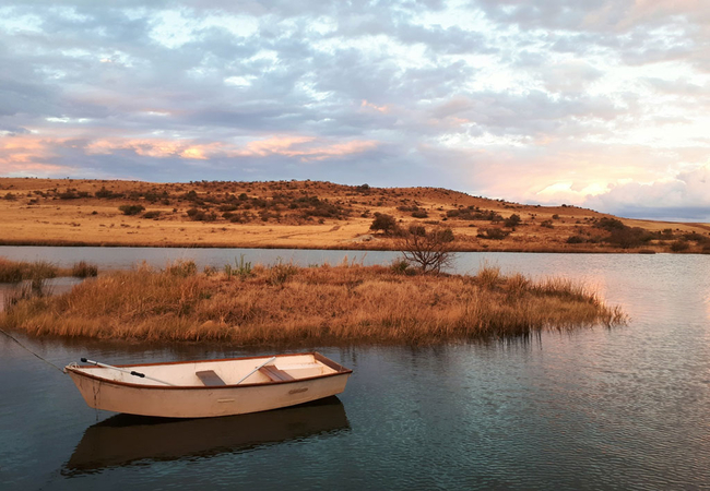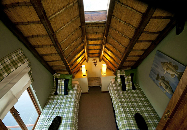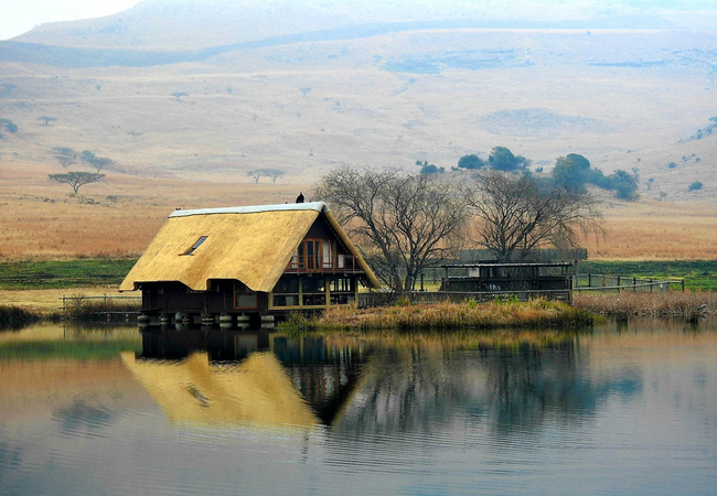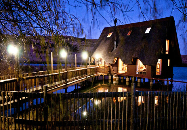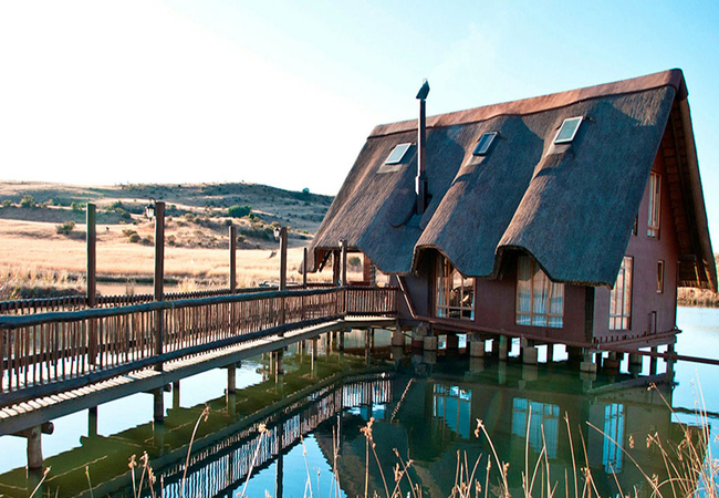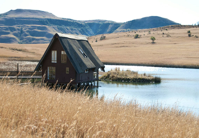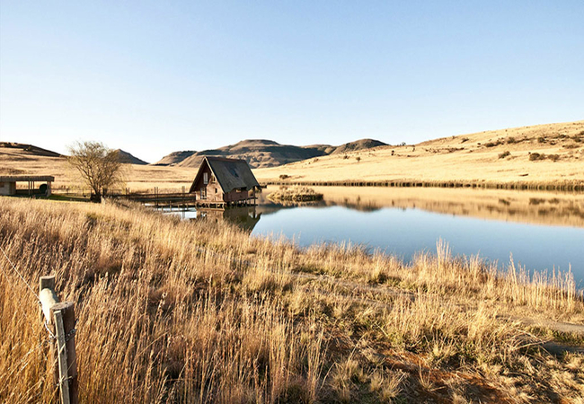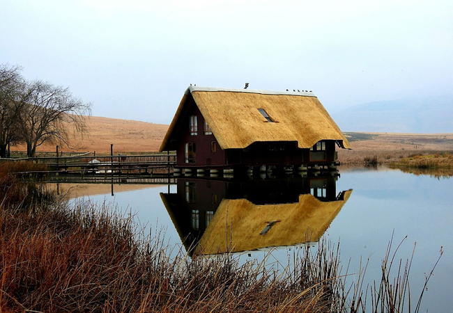 Situated in the scenic and tranquil hills of Biggarsberg, Thatcher's Rest is a delightfully secluded self-catering cottage situated on a working farm. Located between Ladysmith and Newcastle in KwaZulu Natal, this unique thatched roof cottage is set on stilts within one of the six dams on the farm and is accessed from the shore by a wooden walkway.