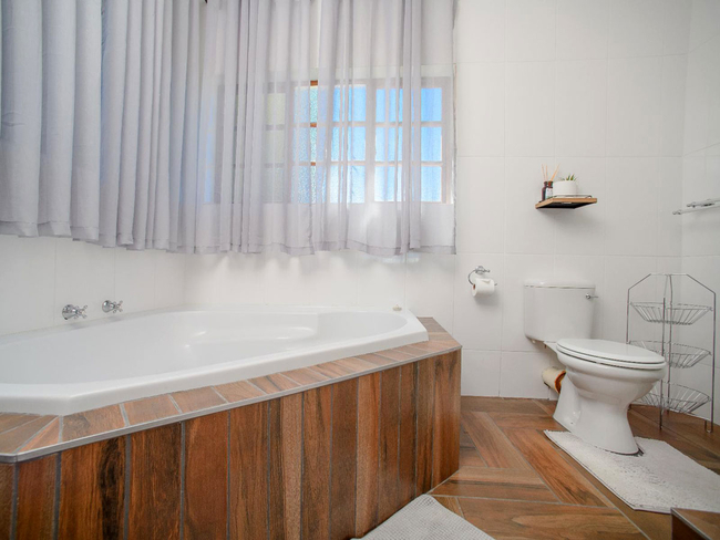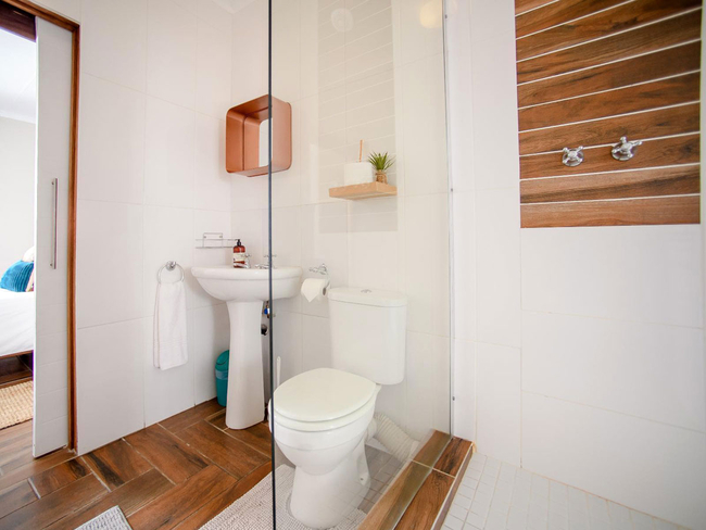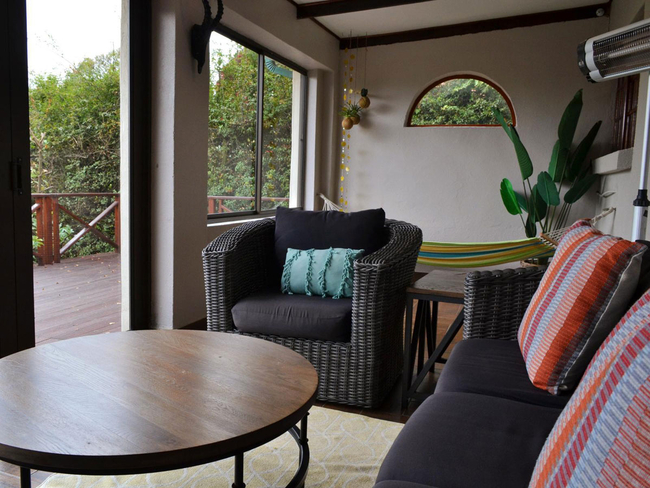 This spacious three-bedroom house comfortably hosts up to six guests. Each bedroom boasts a double bed and en-suite bathroom, ensuring privacy and comfort. The heart of the home is its open-plan living area, seamlessly integrating the dining space, lounge, and kitchen. A highlight is the versatile patio, complete with a built-in braai and nook, comfortable seating, and a serene relaxation corner featuring a hammock. Large aluminum stack doors open onto a wooden deck, creating an ideal setting for leisurely brunches or balmy evening gatherings.