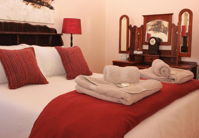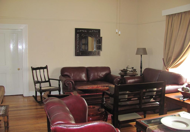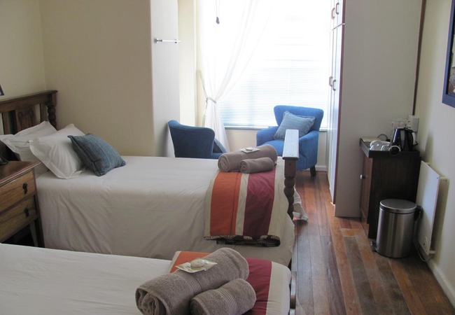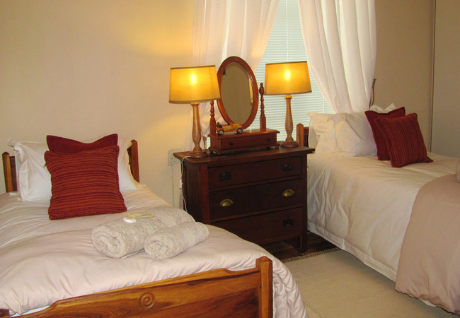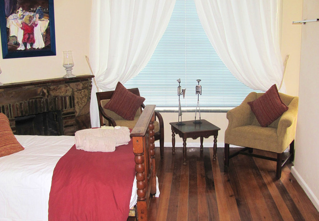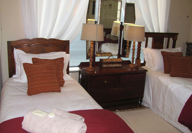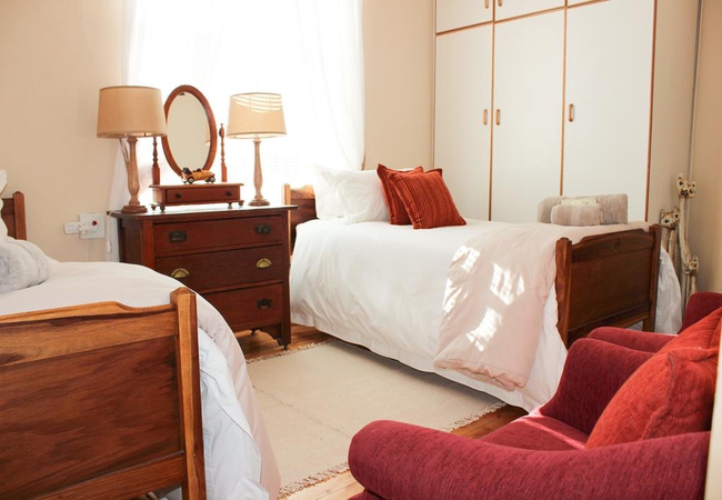 This room faces North and West and is the warmest room in the house because of the afternoon sun. This room boasts two three quarter beds (107cm), two easy chairs, a huge built in cupboard and a hot service point.