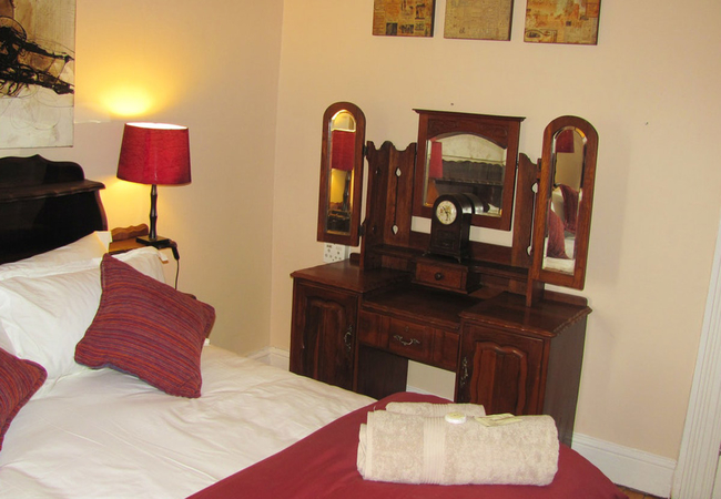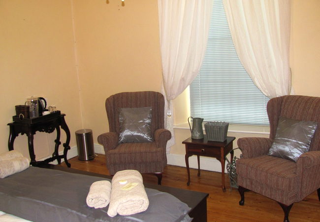 The biggest room we have. It has a huge King size bed (183 cm), two comfortable wing back chairs and a hot service point where tea and coffee can be made. This room faces East so you can observe the daybreak from bed as it unfolds.